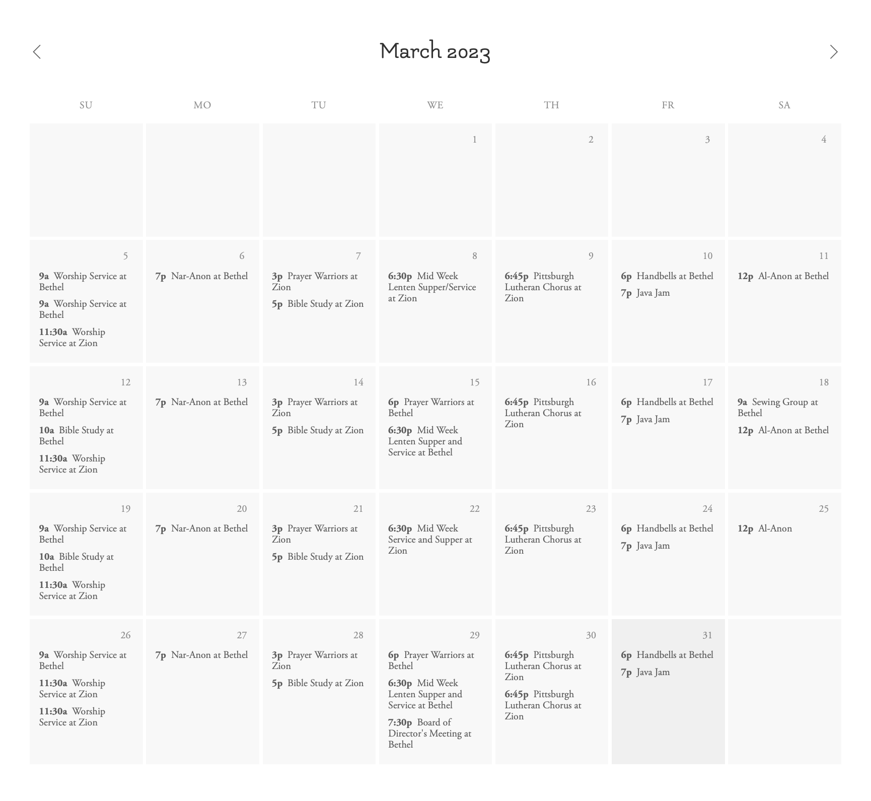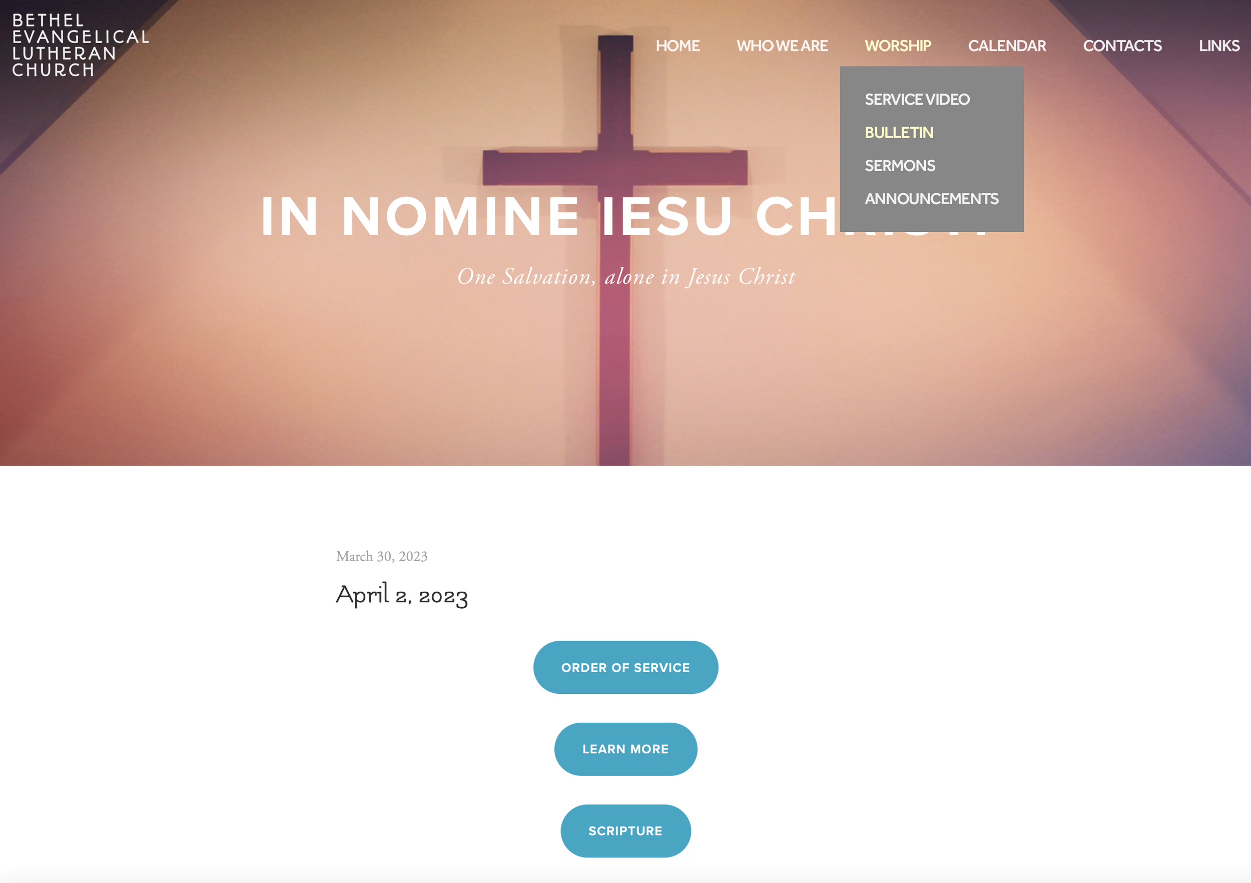 Bethel Lutheran Church’s website offers a service to the community. It provides all the services of a brochure website highlighting the details of the church’s hours, location, and offerings, and it also gives visitors to the site the content of the weekly worship services. Audio and video broadcasts are streamed as well as transcribed Bible readings and full sermons. There is a newsletter and calendar that the congregation can subscribe to, and a prayer chain that they can request addition to. Also featured is a password protected page for board members where meeting minutes as well as documents such as spreadsheets, estimates, and blueprints can be accessed and referenced prior to and during meetings.
